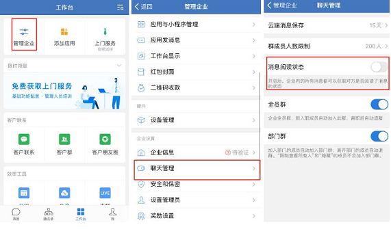 2、我們還可以通過企微手機端設置,點擊進入【工作臺】后,在【管理企業(yè)】—【聊天管理】頁面開啟“消息閱讀狀態(tài)”即可。