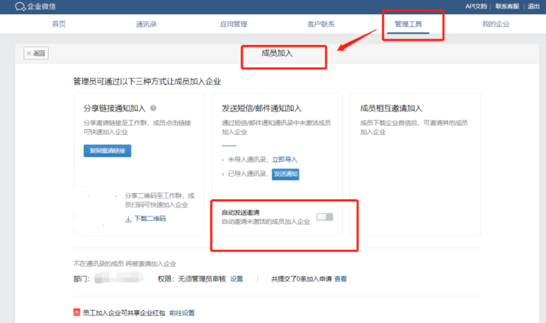 企業(yè)微信自動邀請好友的出現(xiàn),有一種可能是企業(yè)微信管理員沒有關(guān)閉自動邀請好友的選項。在企業(yè)微信管理后臺的“管理工具——成員加入——自動發(fā)送邀請”,企業(yè)微信管理員可能打開了此功能。