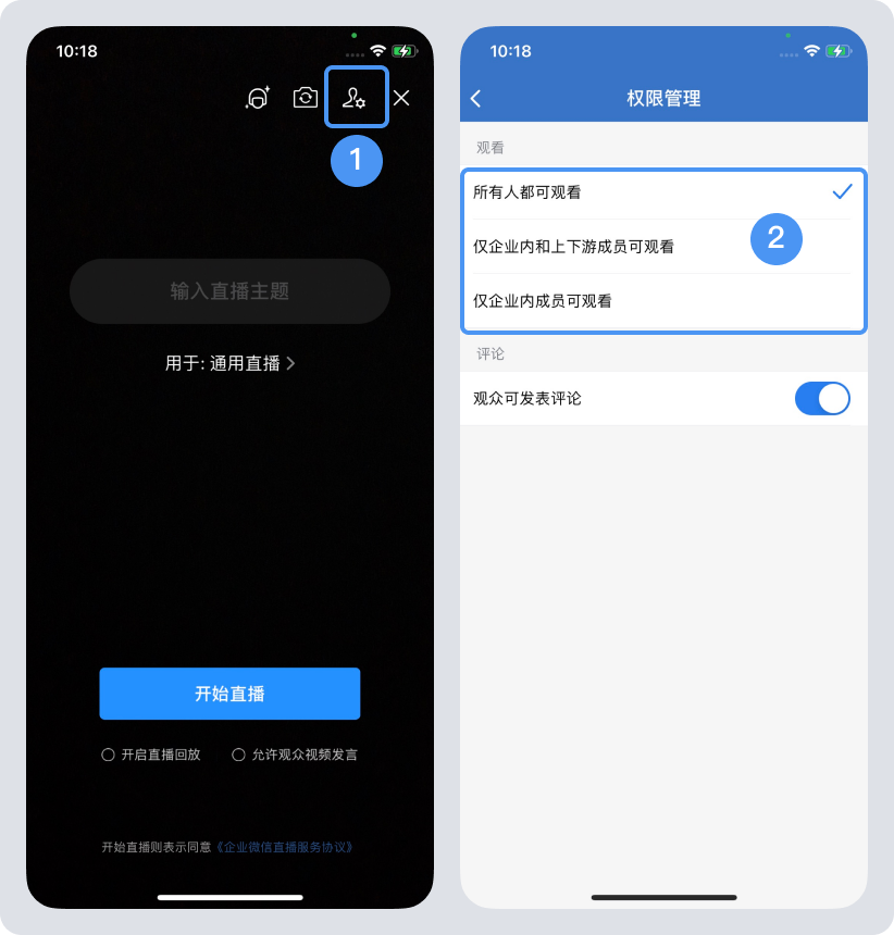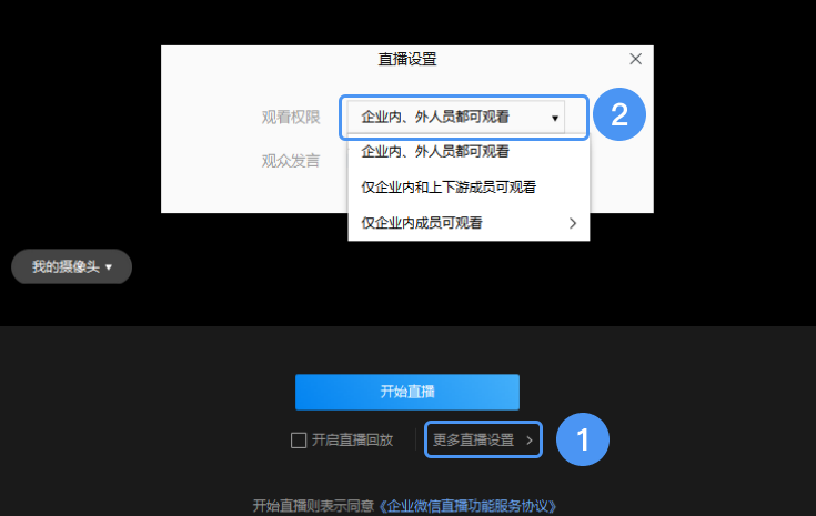 目前企業微信管理員可以在企業微信管理后臺開放設置權限,企業成員在發起直播時可以對觀看對象進行權限設置,比如可以選擇“企業內、外部人員都可觀看”、“僅企業內和上下游成員可觀看”、“僅企業內成員可觀看”、“僅企業內部分成員可觀看”這幾種權限。”