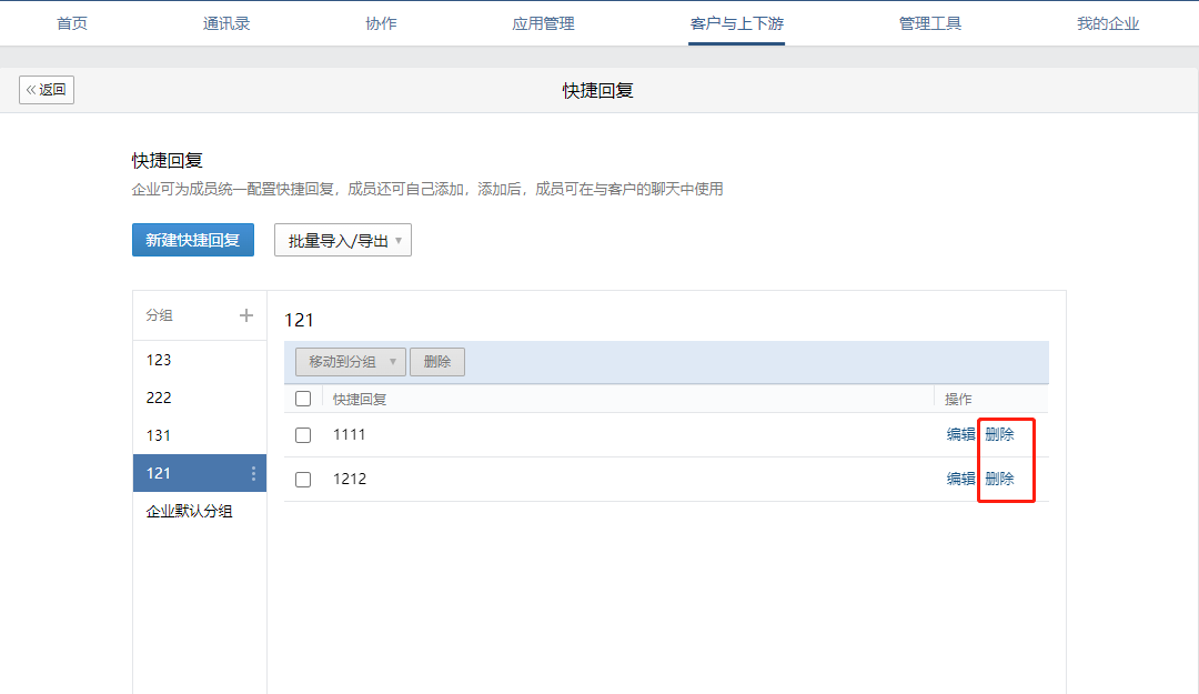 值得注意的是:管理員可以刪除企業新增的快捷回復以及自己新增的快捷回復內容;成員不支持刪除企業新增的快捷回復內容,但是成員自己可以刪除自己添加的快捷回復內容。