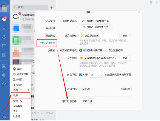 其實(shí)企業(yè)微信聊天記錄遷移的操作很簡(jiǎn)單,只需要登錄企業(yè)微信電腦端,點(diǎn)擊左上角的三條橫杠如下圖,然后選擇【設(shè)置】—【文檔/文件管理】—【聊天記錄遷移】,再點(diǎn)擊【前往遷移】,就能進(jìn)行企微聊天記錄遷移。