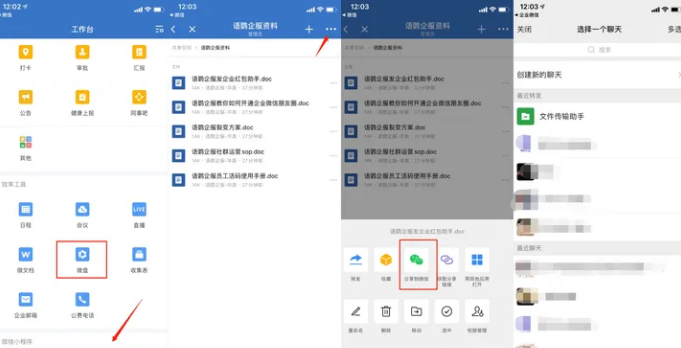 我們打開企業微信后,點擊【工作臺】—【微盤】,然后選擇轉發文件,再點擊右上角的“...”,最后點擊“分享到微信”,選中分享對象發送即可。這樣一來,即便是出差或出去見客戶,也可以通過手機將企業微信文件傳輸到微信。