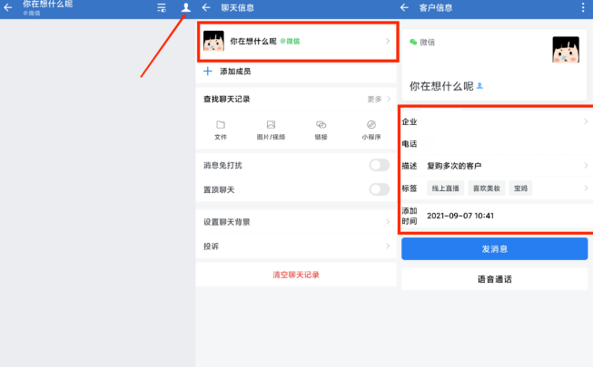 企業微信客戶畫像主要通過企業員工添加客戶好友時加的標簽去展現,員工點擊對話框窗口有上角的人像,再點擊客戶頭像就能查看客戶信息。