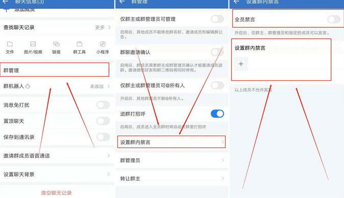 企業微信內部群禁言的設置很簡單,只需要點擊群聊右上角進入群消息頁面,在群管理中就能設置群內禁言。這時可以設置全員禁言或是部分成員禁言,如果選擇部分成員禁,需管理員自行添加禁言成員。