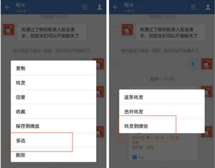 如果想要將企業微信文件轉發到微信中,我們需要在企業微信手機端的聊天窗口中長按想發送的文件,然后在彈出的窗口選擇多選,再選擇左下角的轉發,這時就能看到把企業微信文件轉發到微信的選項了。