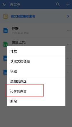 企業微信文件能轉發到微信,那企業微信微文檔中的文件能發送到微信嗎?其實微文檔也能發送到個人微信,我們從【工作臺】進入【微文檔】界面后,只要長按需要發送的文檔即可看到分享到微信的選項。