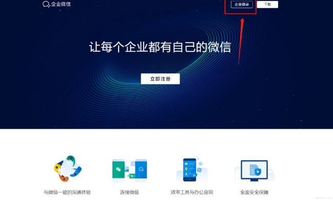 管理員登錄企業微信管理后臺的入口還是很明顯的,就在頁面的右上角,我們點擊一下【登錄】按鈕,再用企業微信掃描二維碼登錄即可進入后臺。