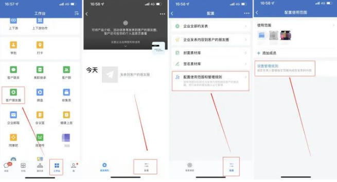 在手機端,通過【工作臺】—【客戶朋友圈】—【配置】,配置使用范圍和管理規則入口給成員添加朋友圈使用權限。
