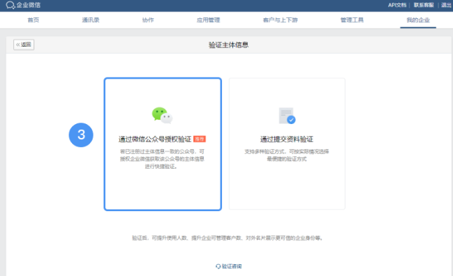 登錄管理端企業微信,在“我的企業”——“企業信息”——“驗證主體信息”——“通過微信公眾號授權驗證”即可。