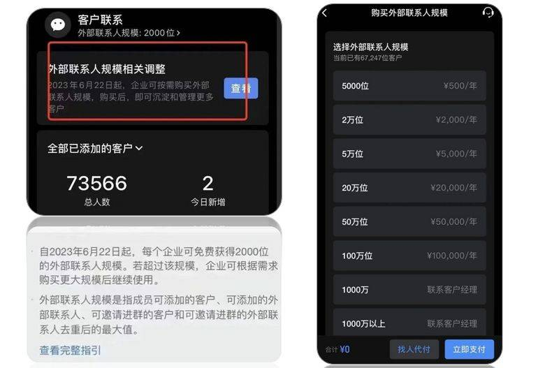 從部分企業(yè)收到的通知來看,外部聯(lián)系人免費(fèi)加好友的規(guī)模是2000名,超過2000個(gè)之后會(huì)有收費(fèi)的調(diào)整。比如5000個(gè)客戶一年需要繳納500元,以此類推,每個(gè)客戶一年0.1元的企業(yè)繳納費(fèi)用。