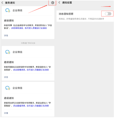 企業(yè)微信關(guān)閉自動(dòng)邀請(qǐng)的操作不復(fù)雜,首先可以在微信的【服務(wù)通知】—【設(shè)置】—【關(guān)閉消息通知】,這樣你就沒辦法接收到邀請(qǐng)通知了,不過也會(huì)導(dǎo)致其他消息被屏蔽。