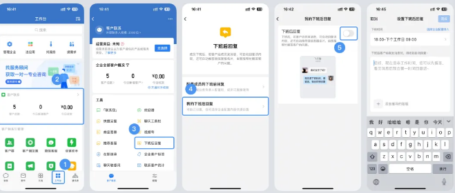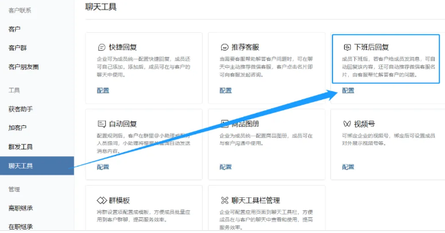 設(shè)置路徑:超級管理員登錄企業(yè)微信管理后臺,按【客戶與上下游】—【客戶聯(lián)系】—【聊天工具】—【下班后回復(fù)】進行配置,完成后就能直接使用,且全員統(tǒng)一。