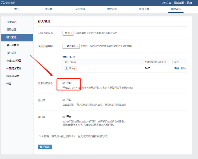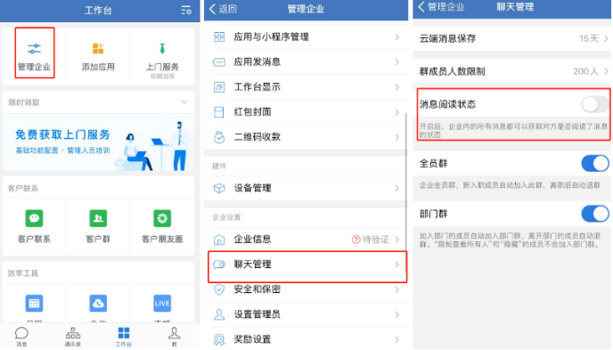 管理員登錄企業(yè)微信后臺(tái),找到【我的企業(yè)】—【聊天管理】版塊,即可調(diào)整【消息閱讀狀態(tài)】。