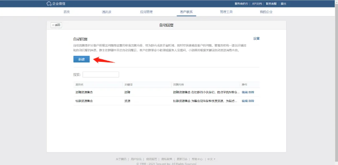 那我們怎么設置企業微信自動回復?首先我們可以點擊自動回復下的規則,再點擊新建,最后輸入關鍵詞內容和回復內容即可設置完成。