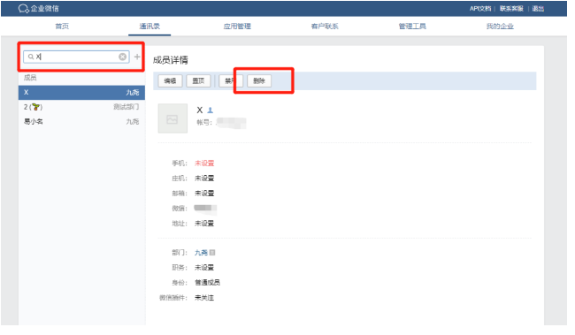 如果企業(yè)成員比較多,不能很快找到離職員工,在左側【搜索成員、部門】中快速搜索離職員工,然后點擊【刪除】按鈕就能刪除這個員工了。
