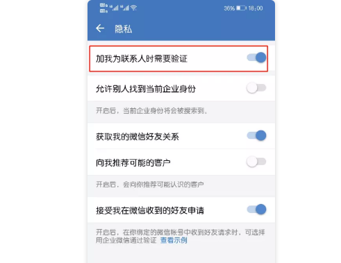 進入手機企微的【我】—【設置】—【隱私】頁面,關掉【加我為聯系人時需要驗證】這個功能。