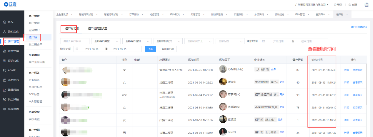 管理員可在管理端根據時間、員工等維度進行篩選查詢僵尸粉,例如可以找出最近一周某個員工流失客戶情況。