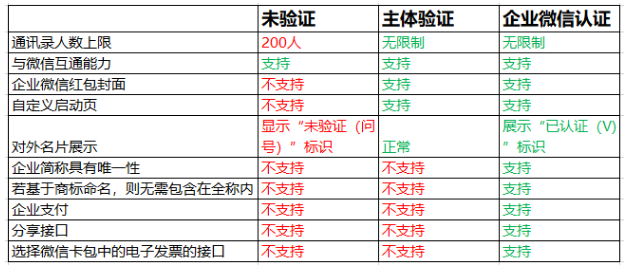 企業微信不認證也是可以進行使用的,但是對企業微信很多功能上的使用會受到限制而無法使用。比如在添加好友人數上、在支付功能上、在對接口的分享上都存在差別。下圖就是未驗證的企業微信、經過主體驗證的企業微信、認證過的企業微信它們之間的區別。