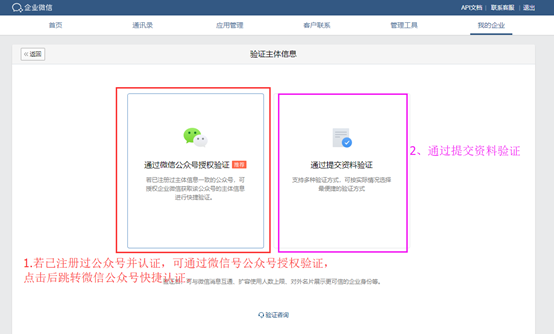 登錄企業微信后臺,我的企業——企業信息——驗證主體信息——提交資料驗證,選擇驗證方式有兩個,如果選擇“通過提交資料驗證”,就可以看到“企業微信認證”的選項了。之后按照各種步驟提交資料進行審核,加上繳納300元的審核費用,然后大約等待5個工作日即可。