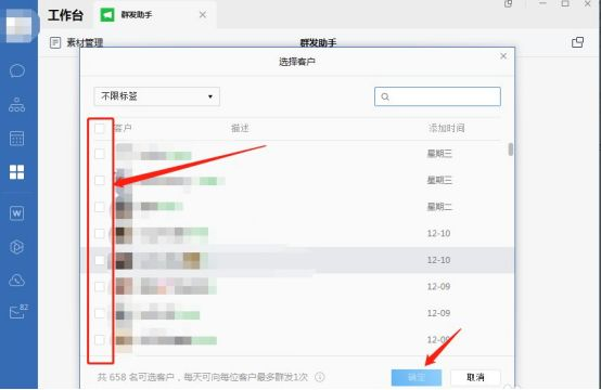 三、點擊【選擇客戶或客戶群發(fā)送】-再點【發(fā)送給客戶】,勾選客戶,點【確定】
