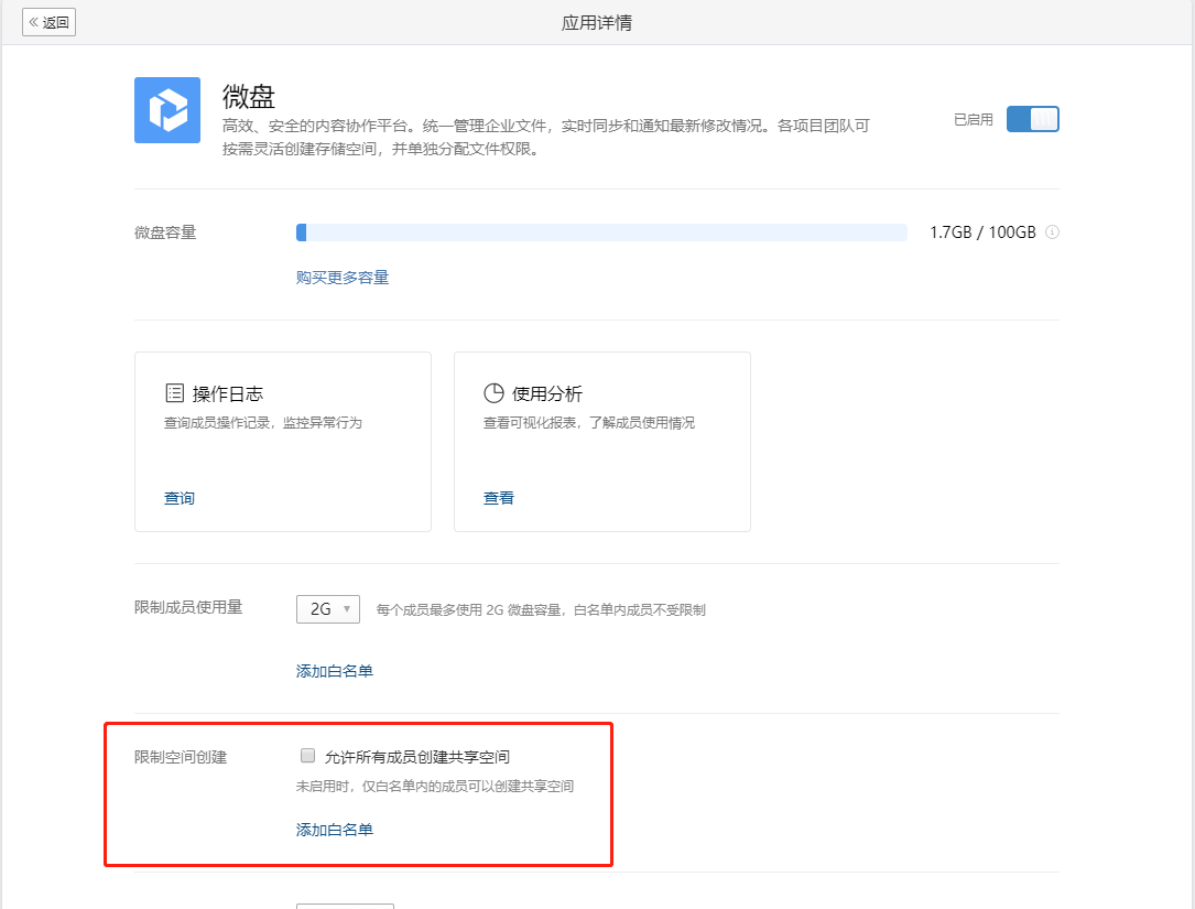 企業(yè)想要?jiǎng)?chuàng)建共享空間,需要有權(quán)限。如果沒有創(chuàng)建權(quán)限,那么在微盤中是無法查看到創(chuàng)建空間的入口的。開通權(quán)限的步驟是:企業(yè)微信管理員在企業(yè)微信后臺(tái),“管理工具”—“應(yīng)用互聯(lián)”—“微盤”—“限制空間創(chuàng)建”—“開啟允許所有成員創(chuàng)建共享空間”,如果不想開啟允許所有成員,也可以選擇添加白名單。