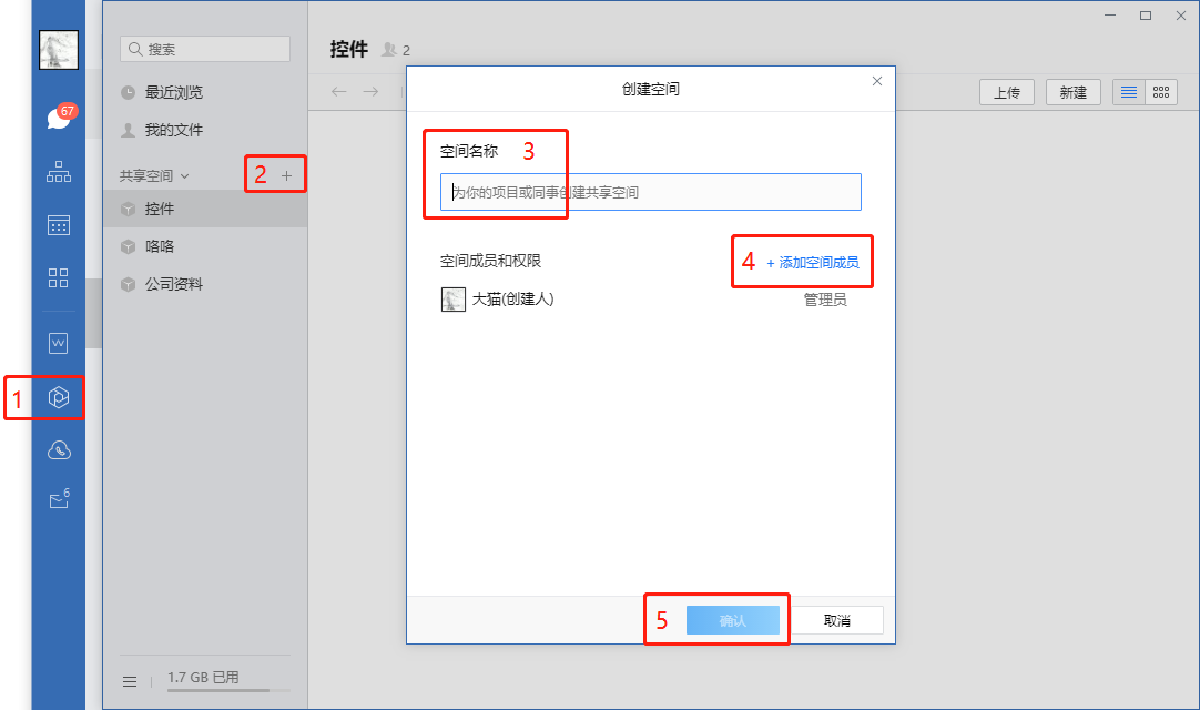 2、企業(yè)微信創(chuàng)建:登錄企業(yè)微信工作臺(tái),打開客戶端左側(cè)欄微盤圖標(biāo)—共享空間“+號(hào)”—“空間名稱”—“添加空間成員”,就可以創(chuàng)建成功了。