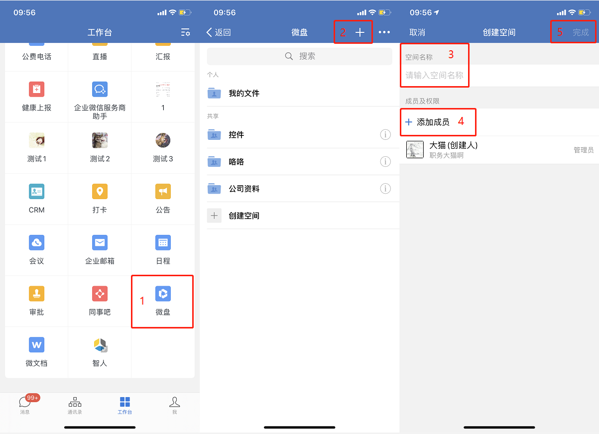 3、手機(jī)端企業(yè)微信APP創(chuàng)建:“工作臺(tái)”—“微盤”—“+號(hào)”—“空間名稱”—“添加成員”,就可以進(jìn)行創(chuàng)建了。