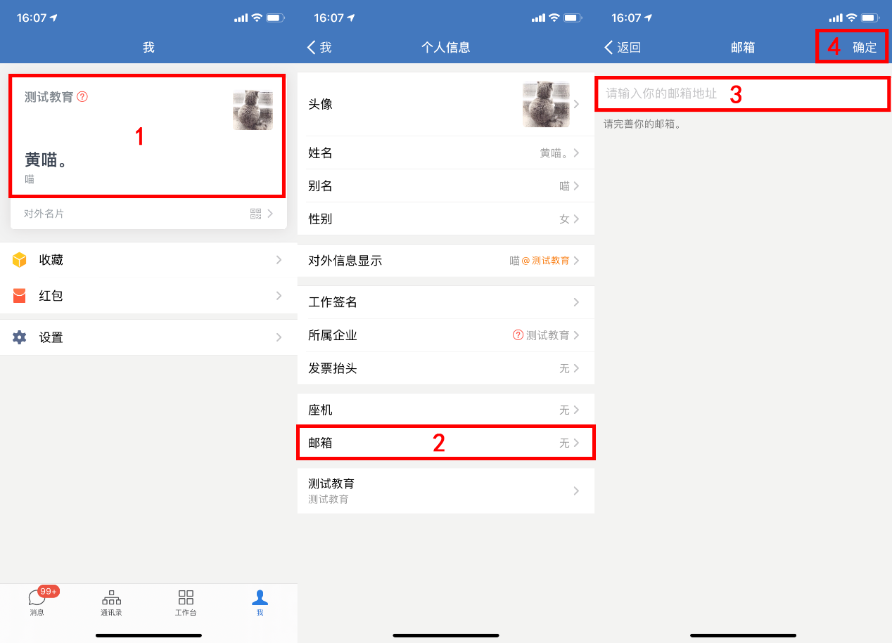 1、企業(yè)微信手機版:“我”——“頭像”——“郵箱”——“輸入新的郵箱”。