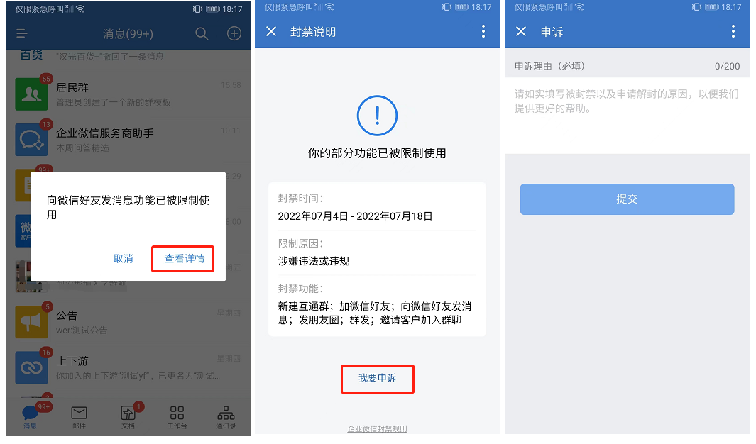 如果是因為其他違規行為導致被處罰封號,非永久封號,如被限制發起外部群群聊,在社群內發消息被限制,登錄企業微信受到限制,使用支付功能被限制,發送朋友圈功能被限制等等情況,可以嘗試根據具體頁面的指引,就是點擊出現限制通知的消息底下“查看詳情”——“我要申訴”,把申訴理由填好,進行提交等待申訴結果通知即可。