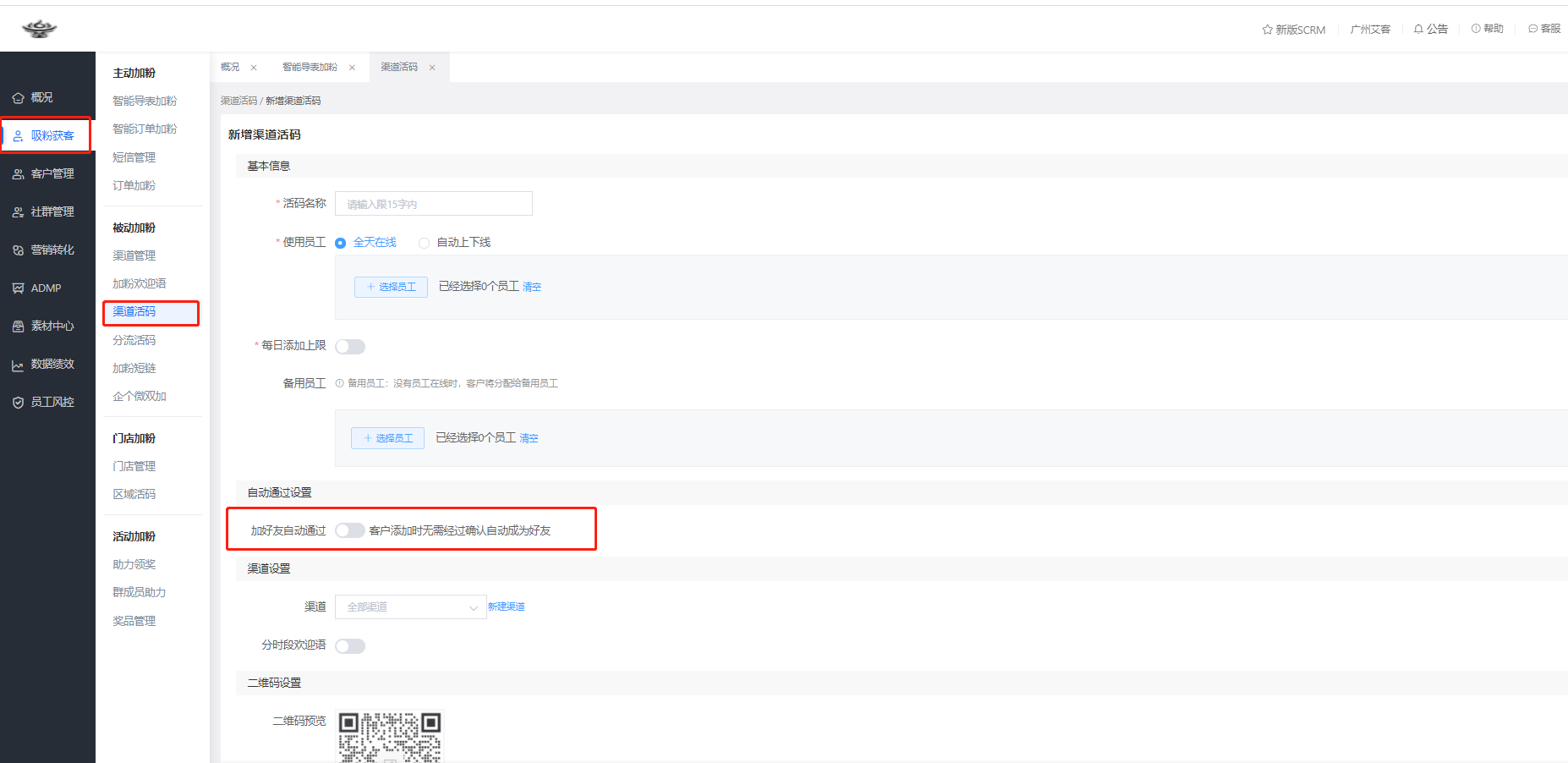 當企業微信配置了艾客SCRM的【渠道活碼】功能后,便可以快速統計客戶渠道來源。渠道活碼除了以上作用外,還有這一大用處,企業在進行渠道投放引流時,短時間會吸引一大批客戶添加,活碼支持一碼多號,可以綁定多個接待客服,有效解決客戶承載問題,不用擔心但時間大量添加同個賬號導致被封的風險。此時企業還可以開啟自動通過好友,客戶添加員工就會自動通過,無需員工手動操作,大大提高了員工的工作效率。