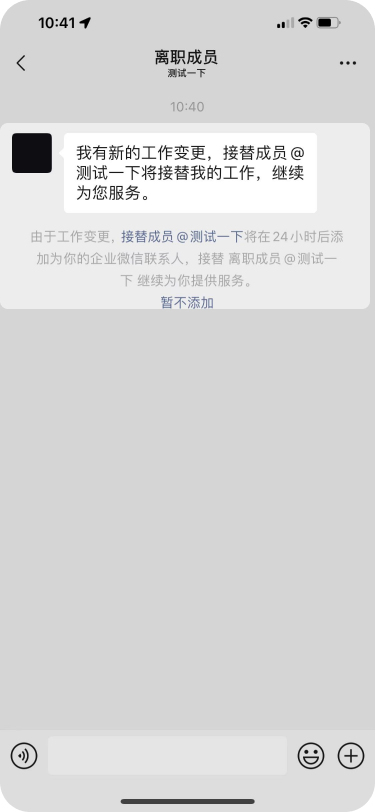 企業(yè)在做完離職繼承操作后,離職員工手上的客戶會(huì)收到一條通知,在內(nèi)容上企業(yè)可以自己設(shè)置,可以說(shuō)明一下自己職務(wù)變更由同事接替繼續(xù)服務(wù)客戶,就大約是這種意思即可。在通知內(nèi)容最下方會(huì)有“暫不添加”的選項(xiàng),如果客戶24小時(shí)內(nèi)不點(diǎn)擊“暫不添加”,那么客戶將在24小時(shí)后,自動(dòng)添加新接替的企業(yè)員工為聯(lián)系人。