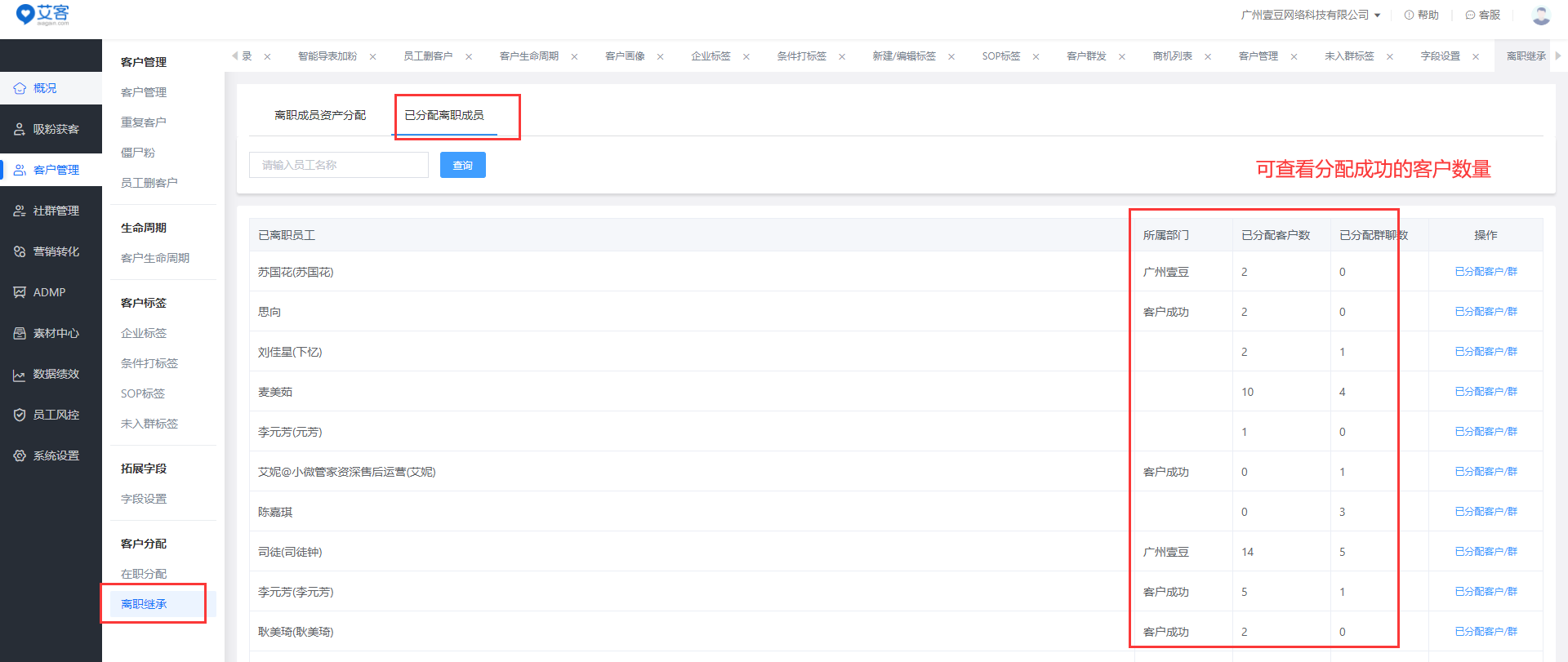 艾客SCRM系統(tǒng)也有【離職繼承】功能,在其功能中企業(yè)可以查看“離職成員資產(chǎn)分配”或者“已分配離職成員”,讓企業(yè)對(duì)離職繼承后的客戶和客戶群心里有數(shù)。
