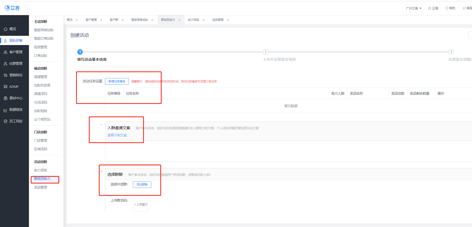 艾客SCRM的群裂變功能——群成員助力,可以輕松解決這一難題,通過設置活動任務,群成員分享或邀請新好友完成任務,即可獲取相應的獎勵,以此來完成裂變,實現以舊帶新。而且想要查看活動數據也方便,即便運營小白,也能借助艾客SCRM開展裂變活動。群裂變艾客后臺設置任務如下圖所示: