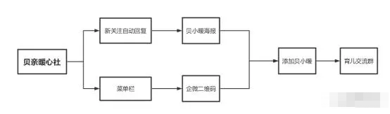 “貝親暖心社”是客戶關(guān)注公眾號(hào)之后,會(huì)收到歡迎語(yǔ),從歡迎語(yǔ)中獲取數(shù)字,發(fā)送數(shù)字后獲得加好友海報(bào),掃碼添加貝小暖,由貝小暖邀請(qǐng)入群。