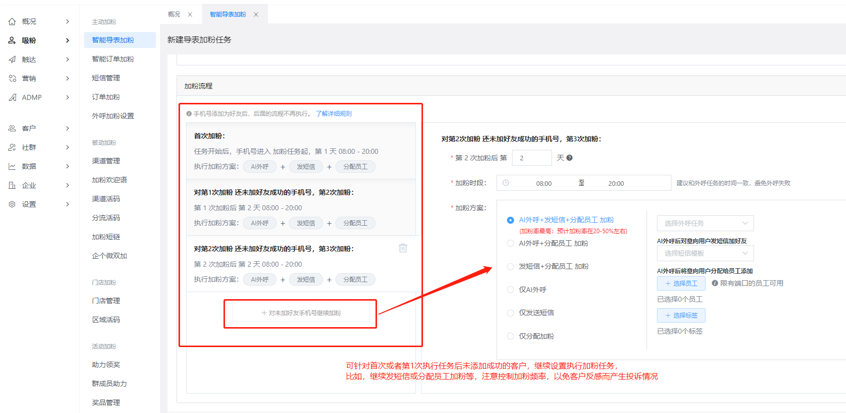 企業可以在加粉任務中建立一個SOP流程,比如第一次加粉不成功,第N天執行第二次加粉操作,第二次加粉不成功,在第N天執行第三次加粉操作......這種流程化的加粉方式,可以提升加粉的成功率。