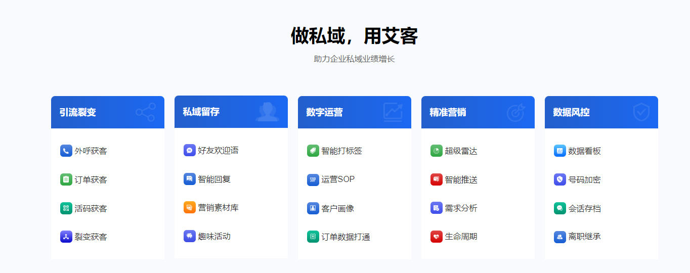 艾客SCRM為廣州壹豆網(wǎng)絡(luò)科技有限公司旗下產(chǎn)品,總部位于廣州,并在上海、杭州、深圳設(shè)有分公司,業(yè)務(wù)覆蓋全國各個(gè)城市。艾客SCRM由企業(yè)微信官方授權(quán)的第三方服務(wù)商,在企微官方合規(guī)范圍內(nèi)進(jìn)行開發(fā),基于企業(yè)微信API開發(fā),使用更加安全可靠。服務(wù)面向全國各地,成立7余年來,先后服務(wù)來自全國1000+企業(yè)及品牌,幫助其高效精細(xì)化運(yùn)營私域,獲得眾多企業(yè)的高度認(rèn)可及青睞。下面為大家簡單介紹幾個(gè)功能: